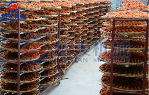4:第一次烘烤 柿果進入柿餅烘干機后,迅速升溫至40——50°c,使柿果內乙醇脫氫酶活性處于最高狀態(tài)。內呼吸也加強,借以快速完成軟化,脫澀和部分脫水(25%左右),持續(xù)時間約12h,視柿果大小,成熟度靈活掌握。干燥柿餅時,防霉十分關鍵,稍有不慎,即會在幾個小時內造成整個烤房中的柿果霉爛損失。因此,需要使烤房內的相對濕度始中保持在70%以下,可有效防止柿果霉變。
