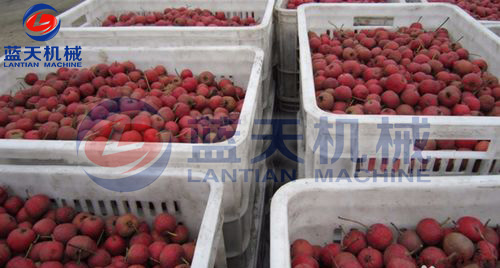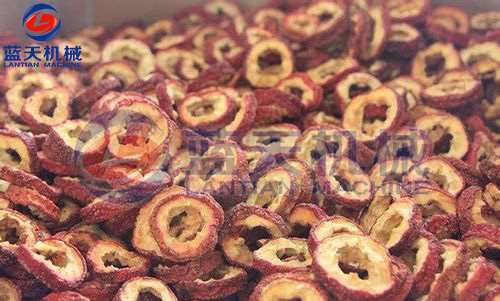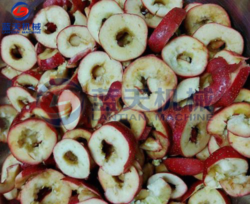 第二步:洗凈山楂果后,要盡快擦干其外表的水分,再進(jìn)行切片處理,需要去除或保留果核。現(xiàn)在也有專門的切片機(jī)器,效率很高,且切片的厚薄均勻,一般在3mm左右。