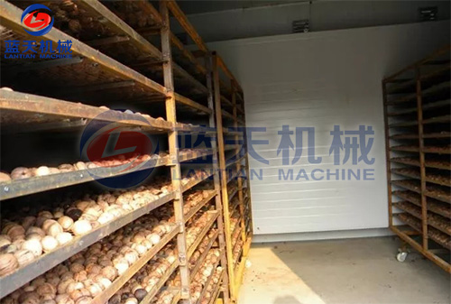 脫青皮后8小時(shí)內(nèi)入倉上架排濕烘烤,排濕溫度35-40℃,烘烤時(shí)間12-15小時(shí),果殼表面水分散失,顏色由黑褐轉(zhuǎn)為褐色時(shí)排濕結(jié)束。
