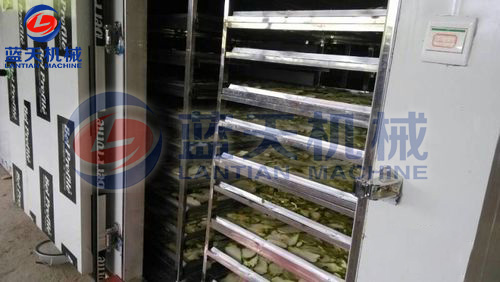 將切片好的佛手片放置于物料車托盤,注意堆放厚度不要超過3CM,這樣有助于烘房內(nèi)平流風(fēng)對整個物料的烘干效果保持一致性。