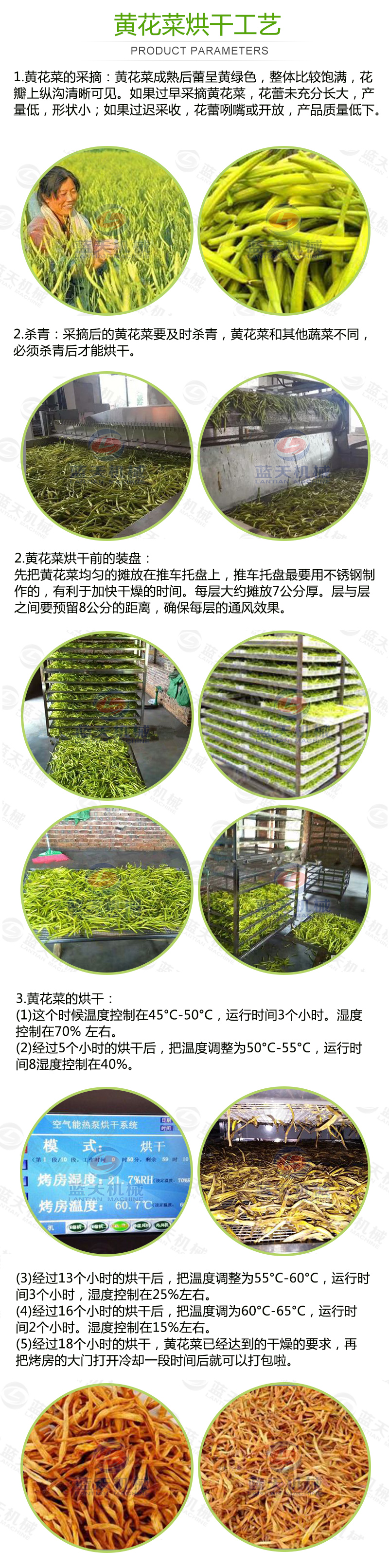尾末的一段時間的烘干過程,要注意觀察黃花菜排水及干燥的程度,可根據(jù)干燥情況,繼續(xù)升高溫度,再烘干4小時左右,然后結束整個烘干流程。