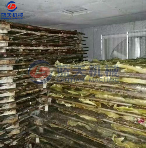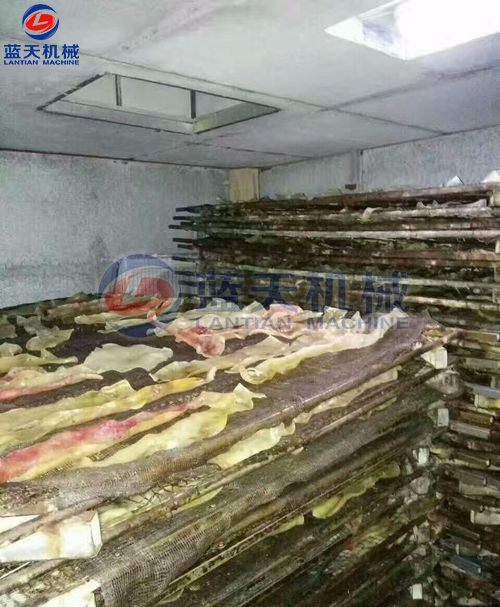 是利用太陽(yáng)曬干的,整個(gè)過(guò)程需要持續(xù)四五天的時(shí)間,還需要工人在現(xiàn)場(chǎng)看管,但也避免不了蟲(chóng)蟻灰塵的污染。如遇上陰雨天,豬皮曬干不及時(shí)就可能走味,給豬皮的干燥帶來(lái)諸多麻煩。