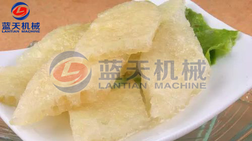 可選用煺毛后的、無(wú)疫病、無(wú)疤痕的豬皮。先將剝下的豬皮放入溫水中浸泡30分鐘,然后用竹刷或塑料刷刷洗,用刀刮除表皮上的污物,修凈污物,去凈雜毛并采取連根拔除的方法,盡量不用利刀刮毛的便利方法,避免將毛根留在肉皮內(nèi)而影響成品品質(zhì),將殘留的肉皮表面的脂肪用刀修理干凈,要求不得殘留一絲脂肪,以免影響油爆漲發(fā)的程度,然后將清洗干凈、已去除脂肪的豬皮進(jìn)行分切整形(有些地區(qū)的傳統(tǒng)工藝需要蒸煮后在分切),分切快形大小在5-10平方厘米之間,不得超過(guò)10平方厘米,否則油爆漲發(fā)后包裝困難,小于5平方厘米的自然皮塊也可以加工,無(wú)需再切成小塊和整形,否則經(jīng)包裝、運(yùn)輸、銷(xiāo)售環(huán)節(jié)后容易造成碎塊,根據(jù)市場(chǎng)需求也可以將豬皮切絲、切丁等形狀,以滿足不同的客戶需求,將切好的皮塊放入物料網(wǎng)格盤(pán),將物料網(wǎng)格盤(pán)像抽屜一樣插入物料車(chē),將物料車(chē)推入烘干房,關(guān)閉封閉門(mén),烘干就可以開(kāi)始了。