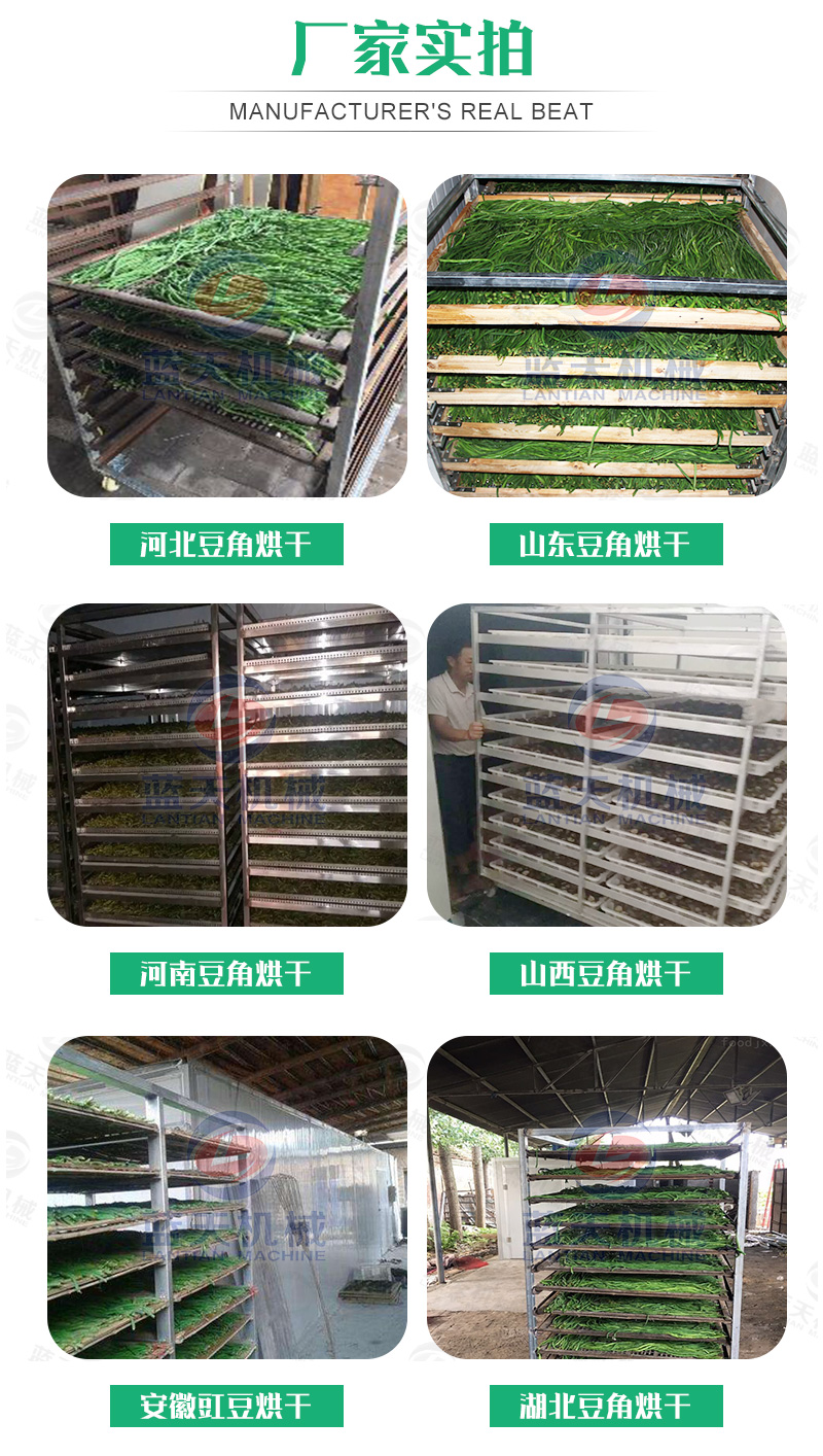 四:運行時間到達后,主機自動停機,待豆角在豆角烘干機內再燜1個小時后,推出物料車,整個豆角烘干完成。