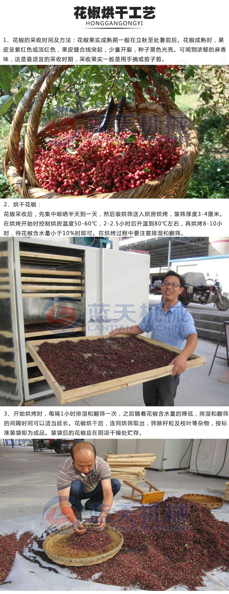 三、晾曬工作晾曬對(duì)花椒品質(zhì)特別對(duì)色澤的影響較大,應(yīng)選晴朗天氣采摘,采摘的椒果要及時(shí)運(yùn)回晾曬,當(dāng)天采收的椒果當(dāng)天晾曬,未曬干的,攤放在避雨通風(fēng)的地方。陰雨天露水過(guò)大的天氣不要采摘。目前我們可以采用花椒烘干機(jī),從而快捷、經(jīng)濟(jì)地將剛采摘下來(lái)的花椒及時(shí)通過(guò)小型花椒烘干機(jī)烘干,保證花椒的色澤和品質(zhì)。但要特別注意溫度調(diào)節(jié)控制,以免影響種子的質(zhì)量。