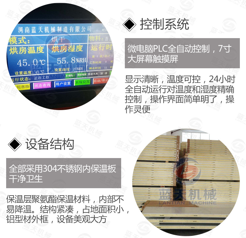 (6)先進(jìn)的合理的烤房結(jié)構(gòu),合理的熱風(fēng)循環(huán)系統(tǒng),保證烘干機(jī)內(nèi)的每處受熱都均勻,品質(zhì)一樣的好